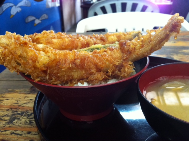 写真はかもめ食堂のアナゴ天丼です。丼からアナゴがこれでもか!って言うくらいはみ出しています。さすが木更津です~♪