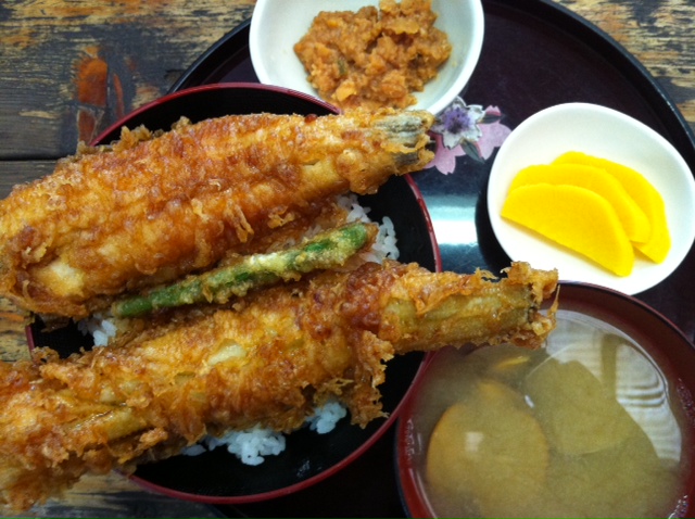 おまけ。アナゴ天丼の全体写真。アナゴが写真の枠からはみ出しています・・・。