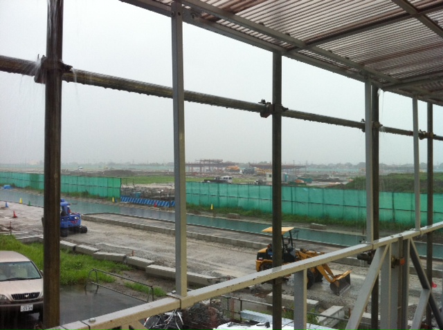 画面中央で小さく見えますが、鉄骨が立ち上がっている所が現場です。事務所からはるか彼方にあります…ヽ(´o`;