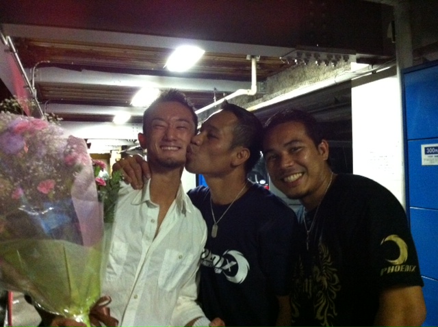 7月の試合を勝利で終えて、トレーナーのビンさんとウアンから祝福されている源治。