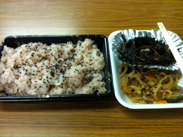 保健所から金田の現場事務所まで戻る途中で、昼ごはんを食べていないのに気付き、「かもめ食堂」に寄る時間も無く、ロードサイドのお弁当専門店(白衣のおばあさんがマスクをしてお弁当とタバコとビールを売っているお店)で買ったお赤飯とヒジキ&切干大根の、お年寄りが泣いて喜ぶ組み合わせの遅い昼ご飯をとりました。