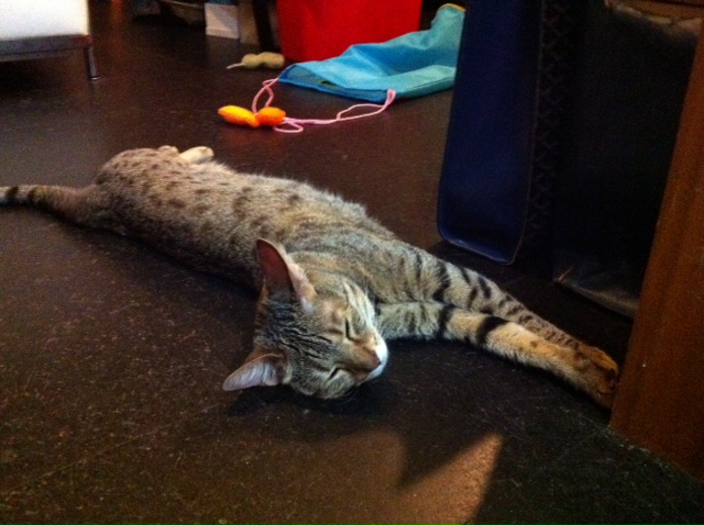 写真はミット奴隷のバイトの合間に休憩する高橋ノッポくん。ベンチが小さく見えますね…。