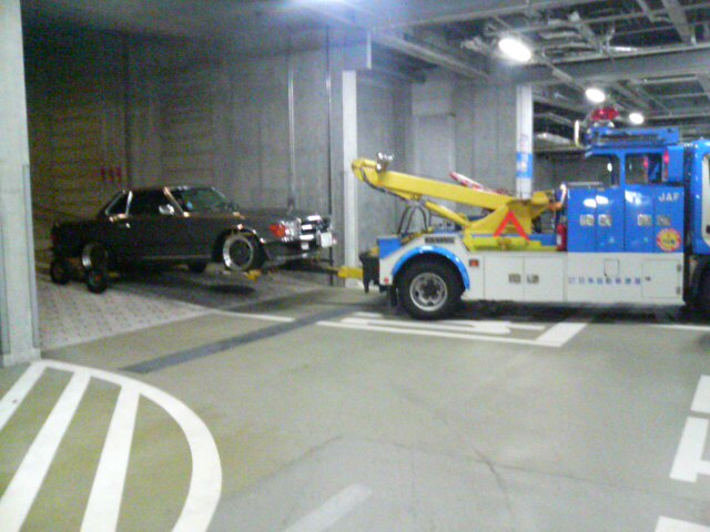 駐車場のスロープを牽引されて降りてくるSL君。僕も余裕が出てきて、ここら辺から既に傍観者のような感じで写真撮影です。気を使ってくれたJAFのお兄さんはフレームの外で待機です…。
