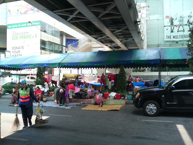 デモ隊のおじさん、おばちゃん、お年寄り達がゴザの上でゴロゴロ寝ています・・・。ちょうどタイは暑い季節だから、寝っ転がりたくなる気持ちは良く分かります。