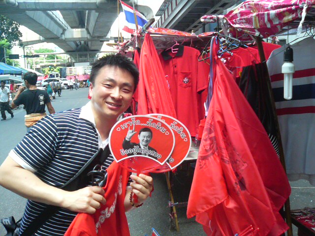 その後、I島さんはバリケード内の売店でタクシン派のポロシャツ、Tシャツ、ウチワをお土産用に大量にお買い上げ~♪