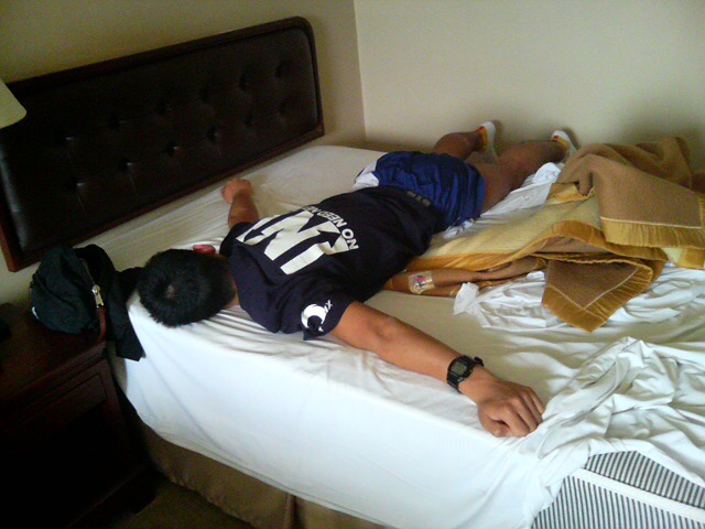 今回人生勉強の為、タイに同行したアマチュア選手のF田君(16歳)。ルンピニースタジアムに行く直前。ベッドの上で瞑想しています・・・(これはやらせではありません)。