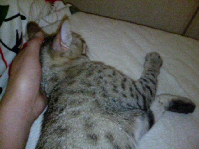 僕の腕枕で寝ています。たまに猫ニャんニャんのポーズもします。