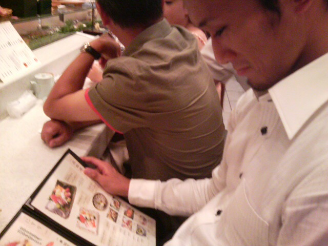 パーティまでの時間調整で入ったお寿司屋さんで、お好みのメニューを食い入るように見ている梅野先生。もちろん支払いは僕です。