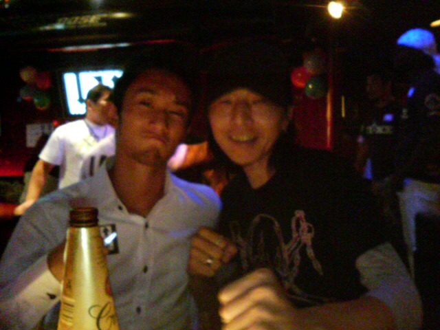 そのうち、近くで飲んでいた外国の女性二人を僕に呼びに行かせて、「俺、梅野源治!知ってる?ジャパニーズフェイマスキックボクサー。ドユノウミー?」と話してました。梅野先生は英語がとても上手くて、僕も外国の女性と自由に話してみたいな~、と思いました。