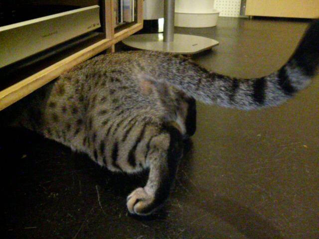 早速コオロギを部屋に放すと速攻で飛び掛りましたが、コオロギもそのままではヤラれません!ピョンピョン跳ねながら、ステレオの配線の方へ潜り込んで逃げて行きます~♪