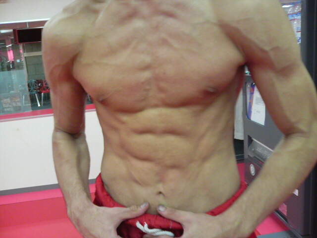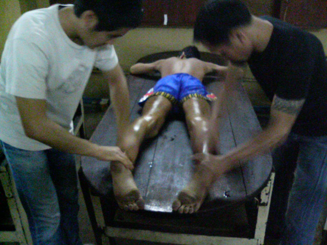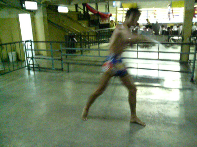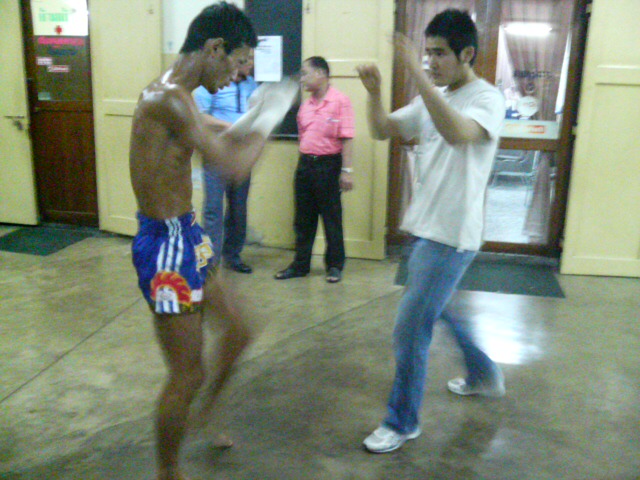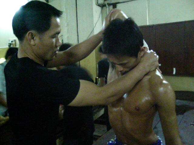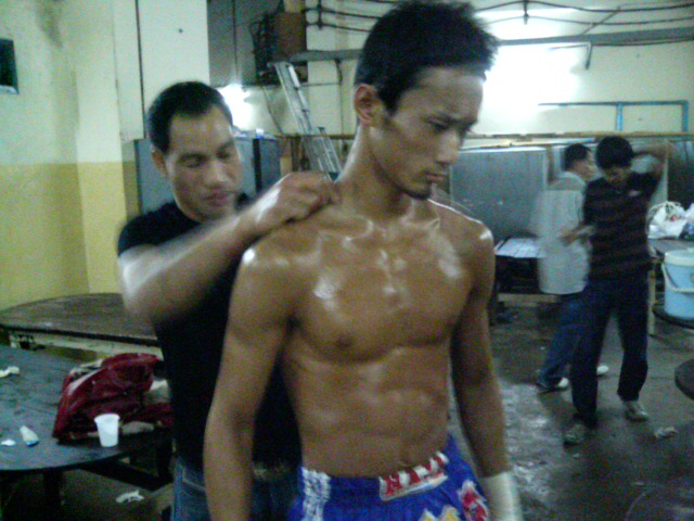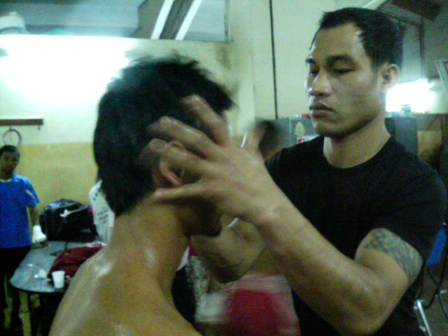 ↓タイオイルを塗る為、タイ人は特に試合の前にUP(身体を温める為の運動)をしない選手が多いのですが、やる気満々の源治は早速ハチマキを相手に自分の動きを確かめながら身体を温めます(ハチマキの仕事その③)。