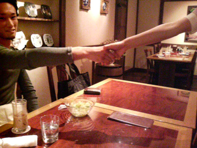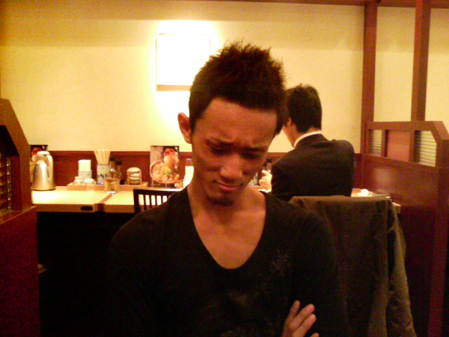 「肉の万世」でウェイトレスの女性に、僕はK-1に出ている有名選手だと言って、握手させている今は無き源治です・・・。
