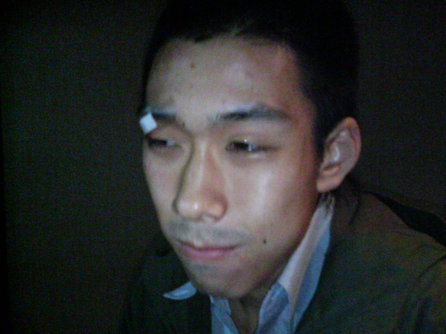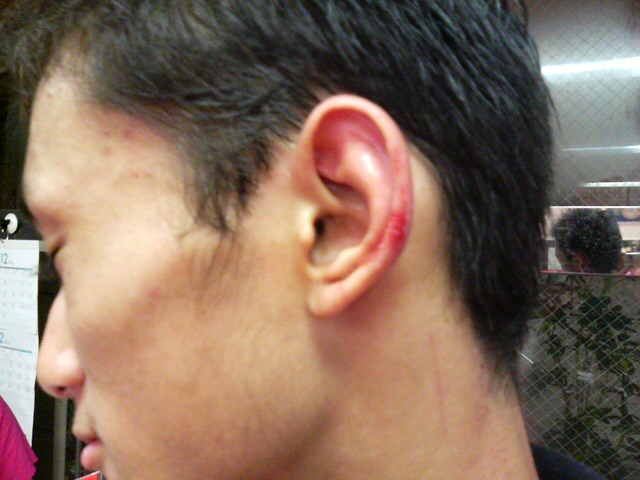 昨夜Stadiumに練習に来ていた源治が帰り際に、「耳がこんなになっちゃいましたよ~」。と言うので事情を聞いてみると、ご飯を食べている時に居眠りしてしまい、耳に熱い鍋がくっついて火傷してしまったとのこと・・・。