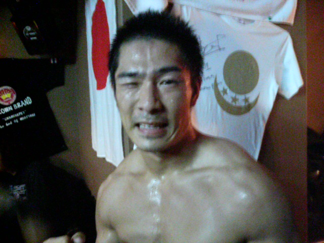 試合は、1Rの初っ端に右足で蹴ったら、また痛めてしまい右足が使用不能に・・・で、仕方ないので(本人談)奥足ローとパンチで攻めて、奥足ローが効いて動きの止まった相手にパンチの連打で見事スタンディングダウンを奪いました~♪