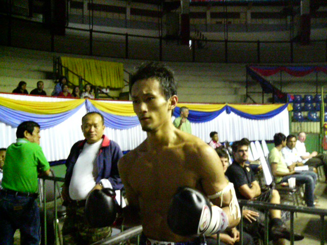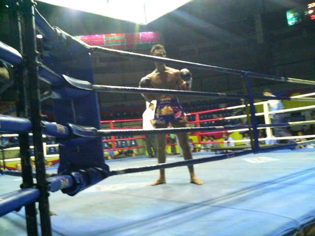 ↓ラジャダムヌンスタジアムのコーナーに立つ源治。