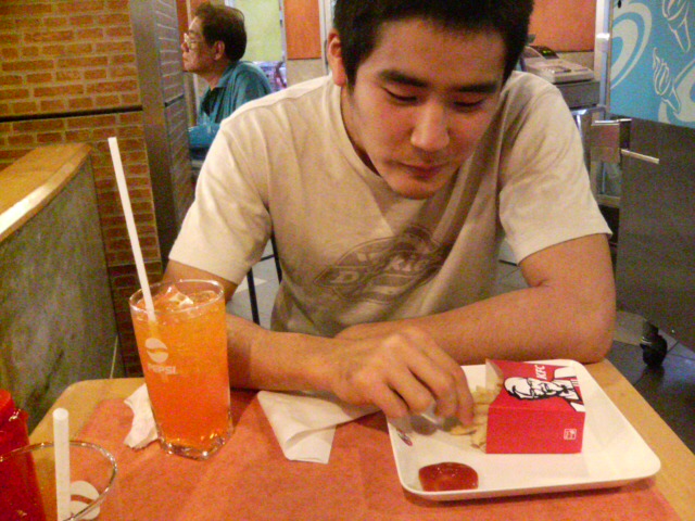 で、当日は予定より若干早くジムに着いたので、その間も源治を休ませる為、付近のケンタッキーで僕等二人はしばし待機。