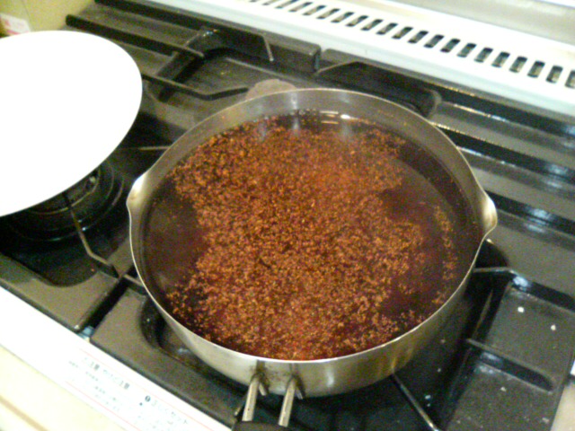 出来上がりの見た目は濃いウーロン茶のようですが、ほとんど無味無臭です。冷えると香りのしない麦茶のようで飲み易いです。毎晩作ってこの三日は毎日1.6ℓ飲んでます~♪