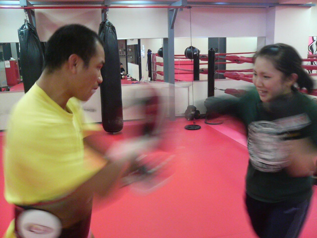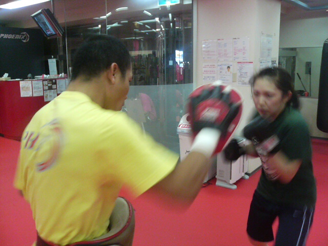 ビン先生にパンチミットを持ってもらっているマドリーヌです。