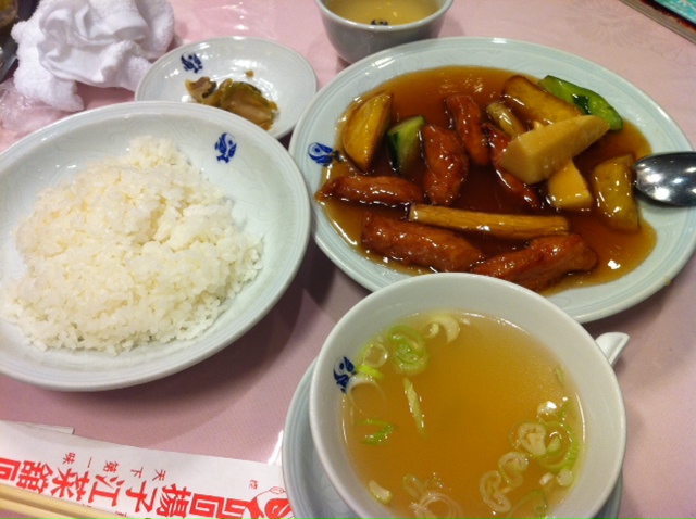 写真は神田すずらん通りの「揚子江菜館」の酢豚ランチです。サツマイモときゅうりを拍子木に切ったのが入っています。初めはちょっとビックリしたけど慣れればこれもアリかなという感じで美味しいです~♪