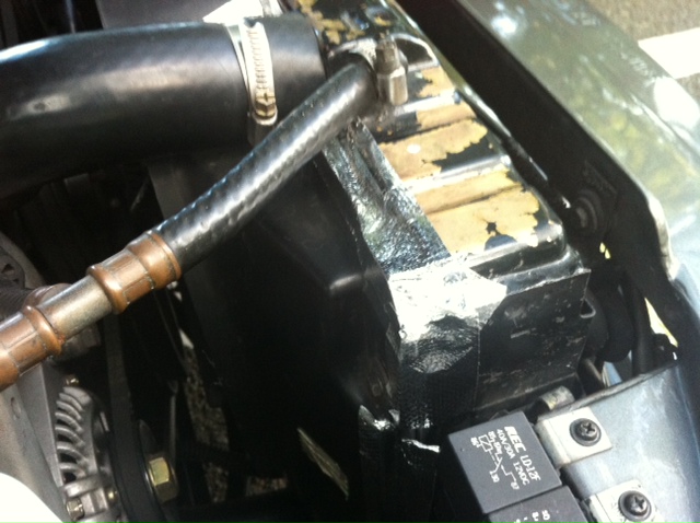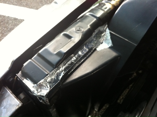 ↓また、昨年の夏は暑くて水温も上がり気味だったので、何か対策をと素人考えでラジエターとファンシュラウドの間を耐熱テープで塞いで、走行時に前から入ってくる風と、アイドル時にファンが吸引する風が隙間から漏れないように効率良く?しました。