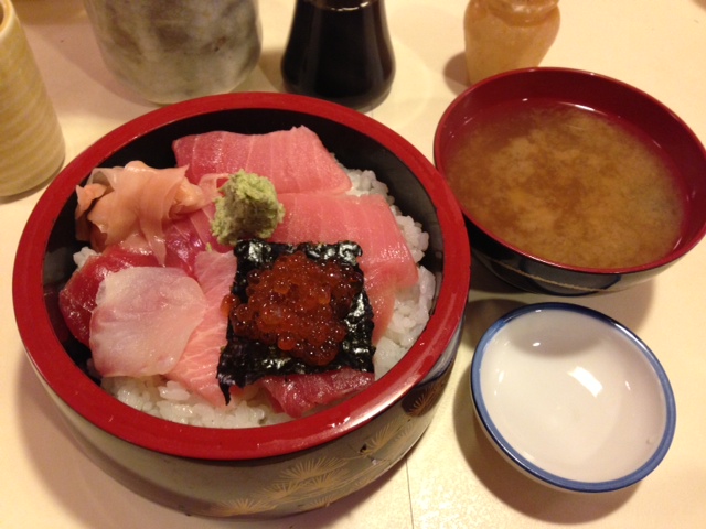 鉄火丼は汁無しで600円とかなりリーズナブルです。今回は奮発して900円の中トロ丼味噌汁付きを頼みました。