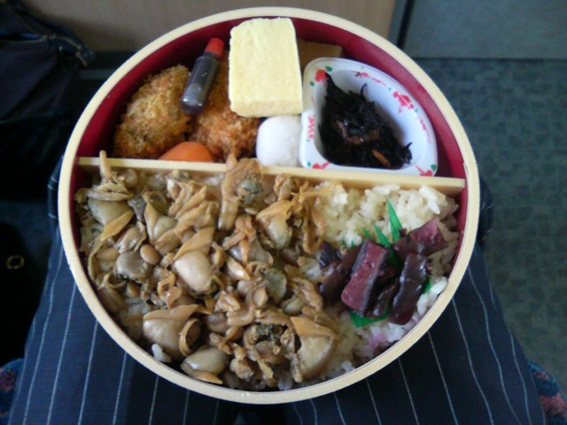 生姜と醤油で煮たアサリが炊き込みご飯の上に沢山乗っています。ひじきの煮たのも入っていて、季節に関係なくいつでも牡蠣フライが二個ついてきます。貝好きにはたまらないお弁当だと思います~♪
