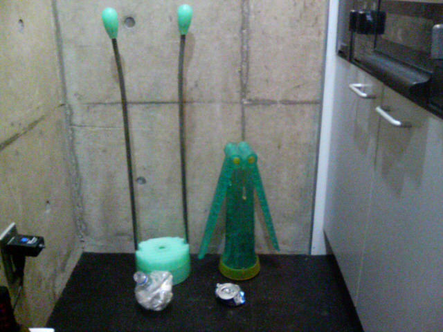 左側はペットボトル用で、棒の上の方の握り玉を両手で握って、マシーンの間に挟んだペットボトルを足で踏んで潰します。こちらは本当に力任せに踏むという感じであまり芸がありません・・・。