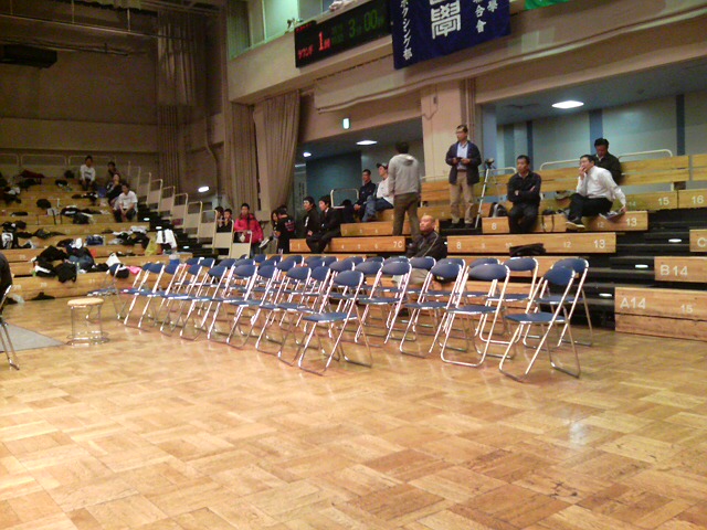 で、肝心のE田君の試合前。赤コーナー応援席は無人・・・