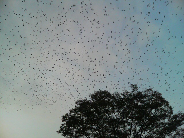 不吉な前兆、春日部駅前名物のムクドリの群れです。うるさいです。