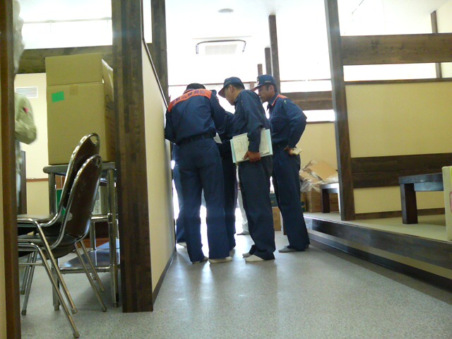 検査の時僕らは、検査官の後を大名行列よろしく金魚の糞のようにぞろぞろ付いて行きます。検査官から何か質問等が有ったら、内装や防災設備、誘導灯非常照明等の各施工業者の立会い者が応えます。