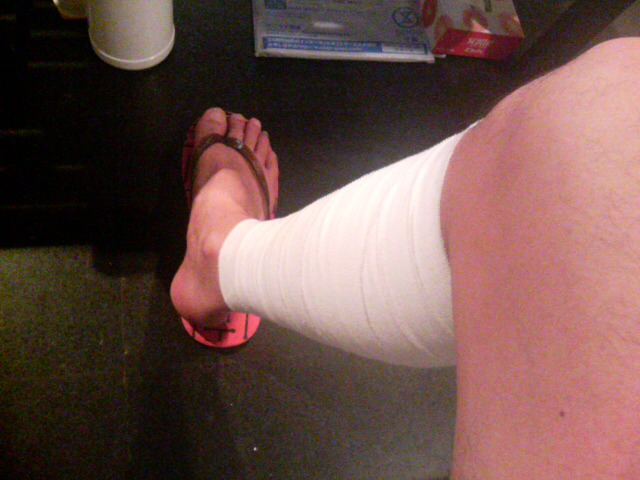 ドクターに診てもらうと、右のふくらはぎが筋断裂していて、何箇所か窪んでいるとのこと・・・。痛み止めと筋肉の緊張を和らげる飲み薬2種類と、シップを処方していただく、また、歩行が困難なので松葉杖もレンタルしてもらう。