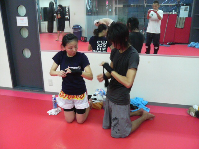 今日は(写真を撮ったのは昔ですが・・・)女性会員のYさんにバンテージの巻き方を教わっています。