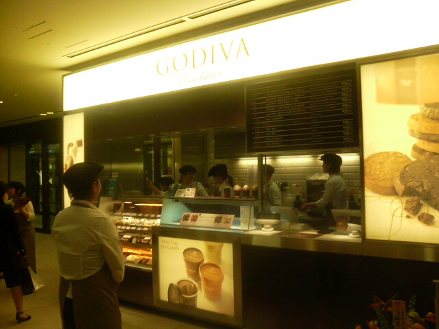 新丸ビルは、地下1階で東京駅の丸の内側地下改札口と接続しており、ビルの入り口にはGODIVAのアイスクリームショップがありました。