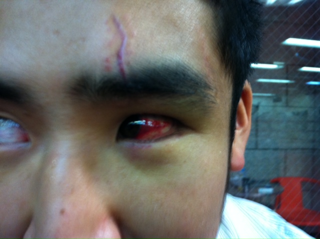 前回の試合で判定負けして、オデコも目も大変なことになっているハチマキ選手(今はもう治っています)。