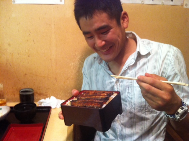 写真は勝った時の約束で二段重ねの鰻重を手にしたハチマキ選手です。
